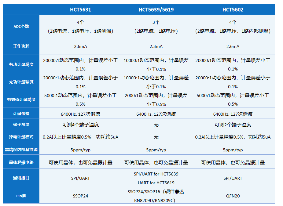 HCT56XX为UART/SPI接口的低功耗、高精度计量芯片,可用于国网/南网单相电能计量表、单相防窃电表、三相锰铜表等应用领域。